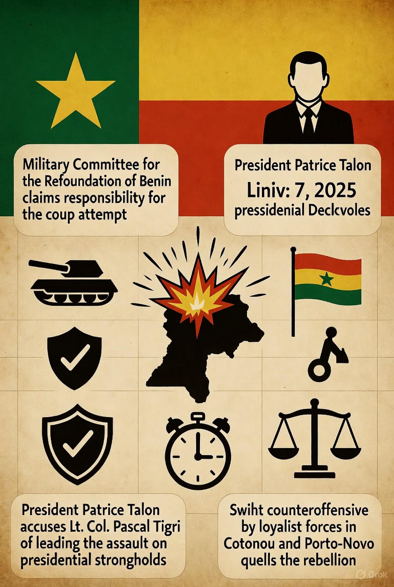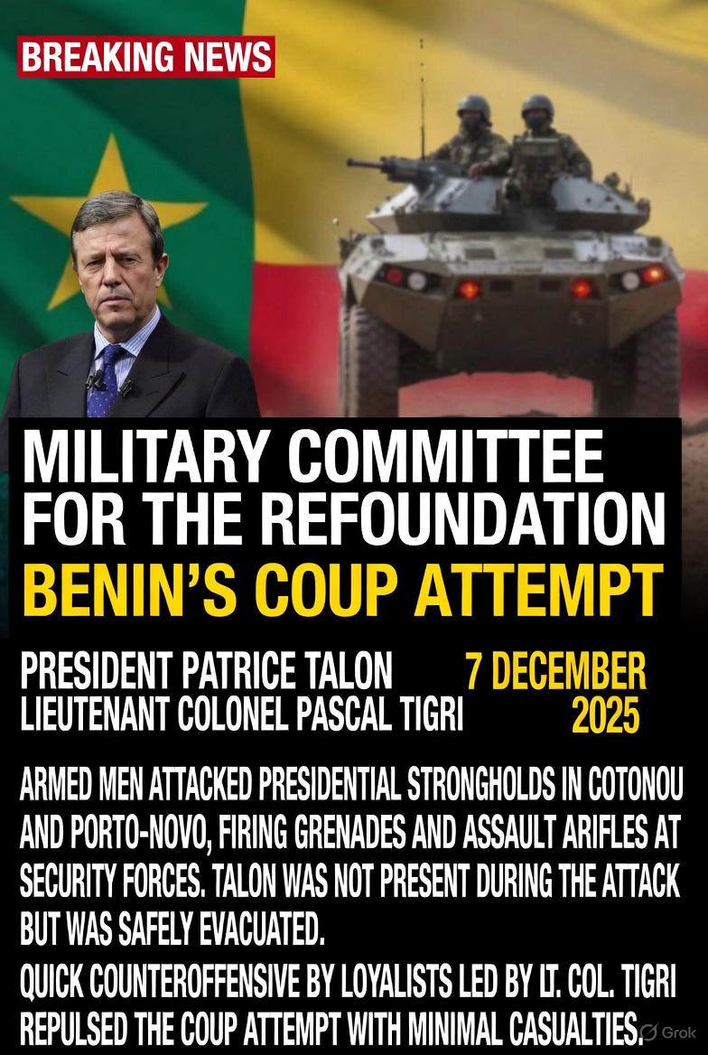 On the morning of December 7, 2025, the West African nation of Benin awoke to the ominous echoes of gunfire and the crackle of state television broadcasting an unprecedented declaration. A cadre of uniformed soldiers, identifying themselves as the “Military Committee for Refoundation,” stormed the national broadcaster in Cotonou, Benin’s economic hub, and proclaimed the dissolution of the government, the suspension of the constitution, and the ouster of President Patrice Talon. Led by Lieutenant Colonel Pascal Tigri, the mutineers vowed to usher in an era of “fraternity, justice, and work,” closing borders and halting political activities in a bid to “restore order.” For a fleeting moment, Benin—a country long hailed as a beacon of democratic stability in a region plagued by coups—teetered on the edge of chaos.