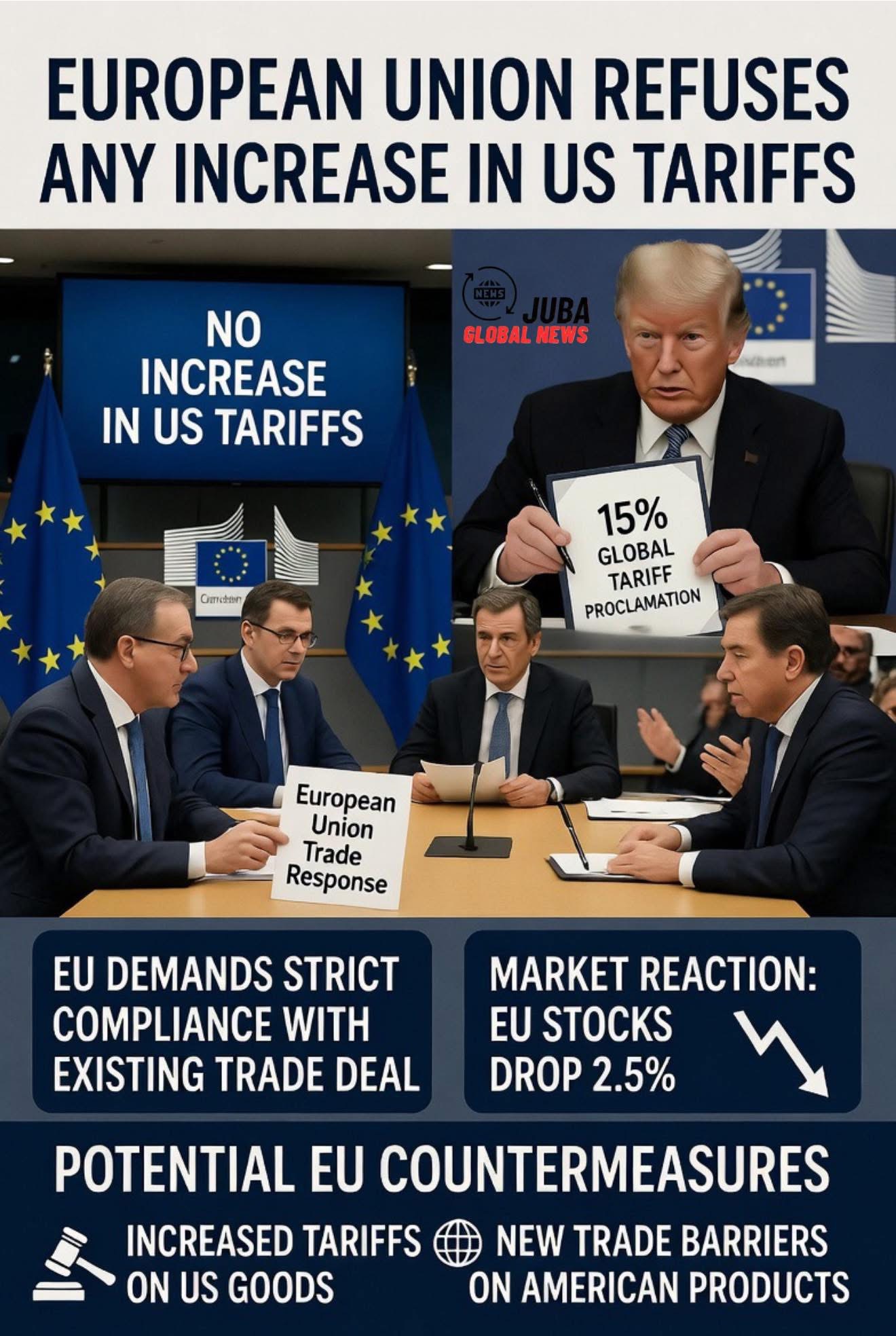 In a strongly worded statement issued on Sunday, February 22, 2026, the European Commission declared that the European Union will not accept any increase in U.S. tariffs beyond the ceilings established in last year’s bilateral trade agreement. The EU insisted that “a deal is a deal,” demanding full compliance from the United States following President Donald Trump’s rapid imposition of a new 15% global tariff—a move that came mere hours after a landmark U.S. Supreme Court ruling invalidated much of his prior tariff regime.