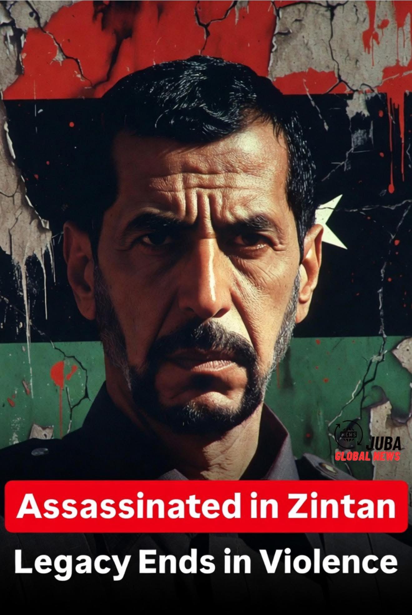 - Dramatic portrait of Saif al-Islam Gaddafi with cracked Libyan flag background, red alert overlay “Assassinated in Zintan” or “Legacy Ends in Violence”.