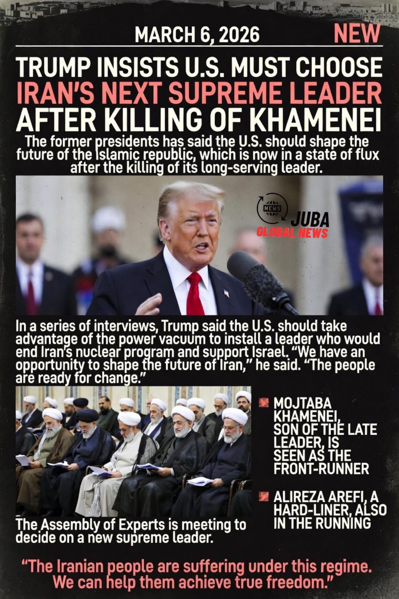 In a series of high-profile interviews and public statements on March 5–6, 2026, President Donald Trump has dramatically escalated the political dimensions of the US-Israel-Iran war by declaring that the United States “must have a role” in determining who becomes Iran’s next Supreme Leader following the targeted killing of Ayatollah Ali Khamenei in the conflict’s opening strikes. Trump explicitly labeled certain potential successors as “unacceptable,” most notably Mojtaba Khamenei—the late Supreme Leader’s son and long-rumored heir—calling him a “lightweight” unfit to lead.
